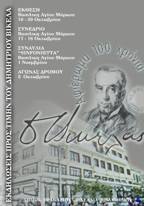 Ο Δήμος Ηρακλείου διοργανώνει έκθεση με αφορμή την συμπλήρωση εκατό χρόνων από το θάνατο του Δημητρίου Βικέλα και τα εκατό χρόνια λειτουργίας της Βικελαίας Δημοτικής Βιβλιοθήκης στη Βασιλική Αγίου Μάρκου. Τα εγκαίνια της έκθεσης θα πραγματοποιηθούν τη Δευτέρα 13 Οκτωβρίου 2008 και ώρα 19:00.
