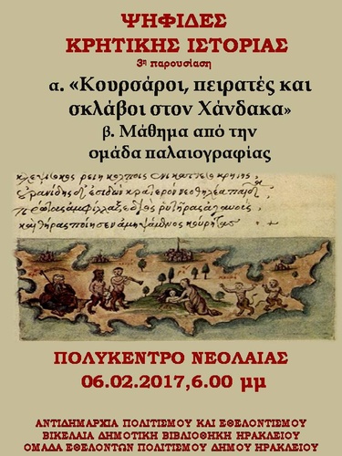 Η 3η παρουσίαση  θα πραγματοποιηθεί στο Πολύκεντρο Νεολαίας (Ανδρόγεω 2) τη Δευτέρα 6 Φεβρουαρίου και ώρα 18:00, με θέμα «Κουρσάροι, πειρατές και σκλάβοι στο Χάνδακα» θα συνοδευτεί και με διαδραστικό μάθημα από την ομάδα Παλαιογραφίας της Βικελαίας Δημοτικής Βιβλιοθήκης.