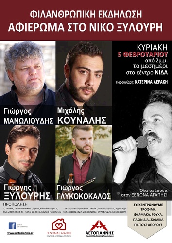 Μιχάλης ΚΟΥΝΑΛΗΣ, Γιώργος ΜΑΝΩΛΙΟΥΔΗΣ, Γιώργος ΓΛΥΚΟΚΟΚΑΛΟΣ, Γιώργης ΞΥΛΟΥΡΗΣ και πολλοί άλλοι σημαντικοί καλλιτέχνες με τα συγκροτήματά τους, ενώνουν τις δυνάμεις τους για να συγκεντρωθούν τρόφιμα - φάρμακα - ρούχα – παιχνίδια – σχολικά για τους συνανθρώπους μας που τα έχουν πραγματικά ανάγκη! Πρόκειται για μια πολύ μεγάλη Φιλανθρωπική Εκδήλωση οποία θα πραγματοποιηθεί στην Μεγάλη Αίθουσα του κέντρου «Νίδα» (Λινοπεράματα Ηρακλείου, έναντι ΔΕΗ, τηλ.: 2810 822097) την Κυριακή 5 Φεβρουαρίου 2017 από τις 2 μ.μ. το μεσημέρι! Την εκδήλωση οργανώνει, κατά παράδοση τα τελευταία χρόνια, ο Όμιλος Παιδείας & Πολιτισμού «ΑΕΤΟΓΙΑΝΝΗΣ» (www.Aetogiannis.gr) με μεγάλη συμμετοχή από τον κόσμο και σημαντική καλλιτεχνική επιτυχία.