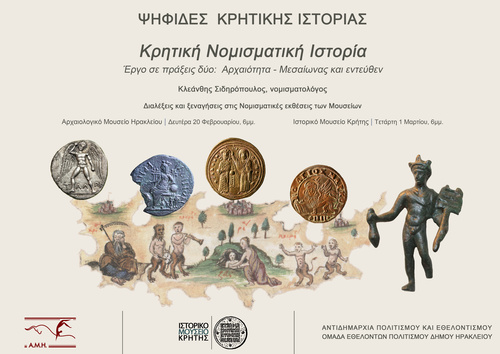 Πρόκειται για μια εκδήλωση σε δύο συνεχόμενα και αλληλοσυμπληρούμενα μέρη υπό τον τίτλο "Κρητική νομισματική ιστορία. έργο σε πράξεις δύο: Αρχαιότητα -Μεσαίωνας και εντεύθεν" με ομιλητή τον αρχαιολόγο-νομισματολόγο Κλεάνθη Σιδηρόπουλο.