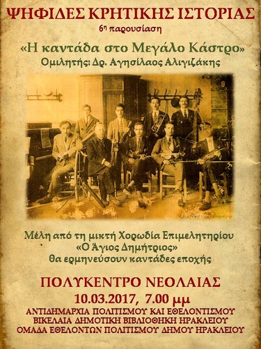 Η 6η παρουσίαση, με ομιλητή τον Δρ. Αγησίλαο Αλιγιζάκη, Ιατρό Ορθοπεδικό- Πολιτισμολόγο, έχει θέμα «Η Καντάδα στο Μεγάλο Κάστρο». Η εκδήλωση θα πραγματοποιηθεί στο Πολύκεντρο Νεολαίας, Ανδρόγεω 2, την Παρασκευή 10.03.2017 και ώρα 19: 00 μ.μ.