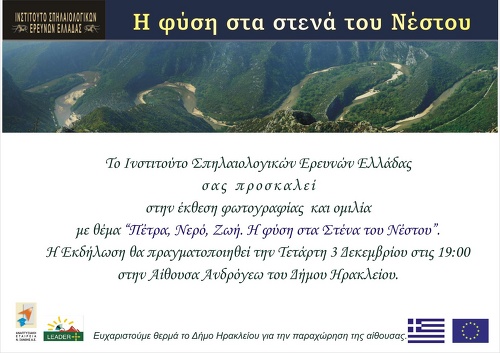 Έκθεση Φωτογραφίας και Ομιλία του Ινστιτούτου Σπηλαιολογικών Ερευνών Ελλάδας με θέμα "Πέτρα, Νερό, Ζωή. Η φύση στα Στενά του Νέστου" την Τετάρτη 3 Δεκεμβρίου 2008 στις 19:00 στην αίθουσα της οδού Ανδρόγεω.