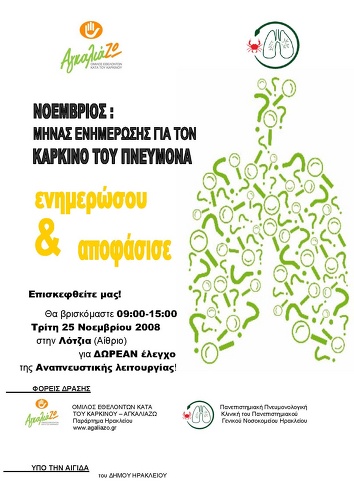 Τα μέλη και οι εθελοντές του παραρτήματος Ηρακλείου του Ομίλου Εθελοντών Κατά του Καρκίνου ΑγκαλίαΖΩ, σε συνεργασία με την Πνευμονολογική Κλινική του Πανεπιστημιακού Γενικού Νοσοκομείου Ηρακλείου (ΠΑΓΝΗ) στο πλαίσιο της ενημέρωσης των συνδημοτών μας σχετικά με την νόσο του Καρκίνου ,και επειδή ο μήνας Νοέμβριος θεωρείται ως μήνας ενημέρωσης για τον Καρκίνο του Πνεύμονα ,Θα βρίσκονται την 25η Νοεμβρίου ημέρα Τρίτη και από ώρας 09.00-15.00 στον Αίθριο Χώρο της Λότζια (ΔΗΜΑΡΧΕΙΟ)για δωρεάν έλεγχο της Αναπνευστικής Λειτουργίας ΣΠΙΡΟΜΕΤΡΗΣΗ.