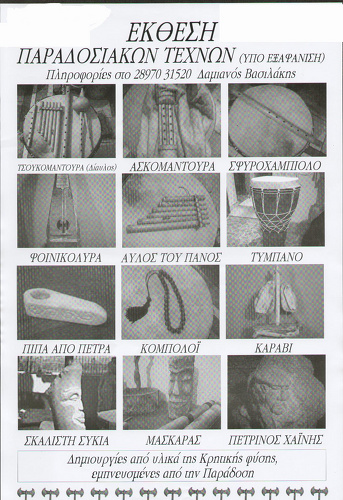 Έκθεση Παραδοσιακών Τεχνών (υπό εξαφάνιση) του Δαμιανού Βασιλάκη θα φιλοξενηθεί από 25 έως 30 Νοεμβρίου 2008 στην Πύλη Αγίου Γεωργίου στην Πλατεία Ελευθερίας. Η Είσοδος είναι ελεύθερη για το κοινό.