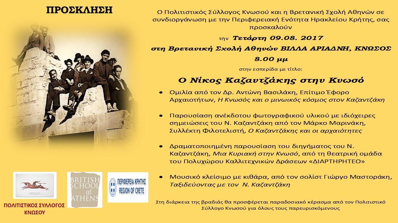Ο Πολιτιστικός σύλλογος Κνωσού και η Βρετανική Σχολή Αθηνών σε συνδιοργάνωση με την Περιφερειακή Ενότητα Ηρακλείου Κρήτης, διοργανώνουν στις 9 Αυγούστου 2017, ώρα 20.00, στο χώρο της Βρετανικής Σχολής Αθηνών, ΒΙΛΛΑ ΑΡΙΑΔΝΗ, ΚΝΩΣΟΣ, εσπερίδα με τίτλο:Ο Νίκος Καζαντζάκης στην Κνωσό.