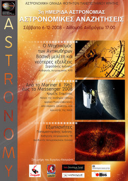 Η Αστρονομική Ομάδα Φοιτητών του Πανεπιστημίου Κρήτης πραγματοποιεί την 3η Ημερίδα Αστρονομίας το Σάββατο 6 Δεκεμβρίου στις 17:00 στην αίθουσα της οδού Ανδρόγεω.  Τα θέματα της ημερίδας είναι:
