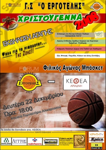 Ο Γ.Σ. ΕΡΓΟΤΕΛΗΣ διοργανώνει Χριστουγεννιάτικη Εκδήλωση Αγάπης την Δευτέρα 22 Δεκέμβρη 2008 ώρα 18:00 στο Κλειστό Γήπεδο Αλικ/σου Μελίνα Μερκούρη.
