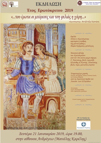 Η Ομάδα Εθελοντών Παιδείας του Δήμου Ηρακλείου υπό την αιγίδα των Αντιδημαρχιών Εθελοντισμού – Πολιτισμού και Παιδείας σε συνεργασία με το Λύκειο των Ελληνίδων Παράρτημα Ηρακλείου και τη στήριξη της Περιφέρειας Κρήτης, με αφορμή το έτος «ΕΡΩΤΟΚΡΙΤΟΣ» 2019, διοργανώνουν την εκδήλωση με τίτλο: