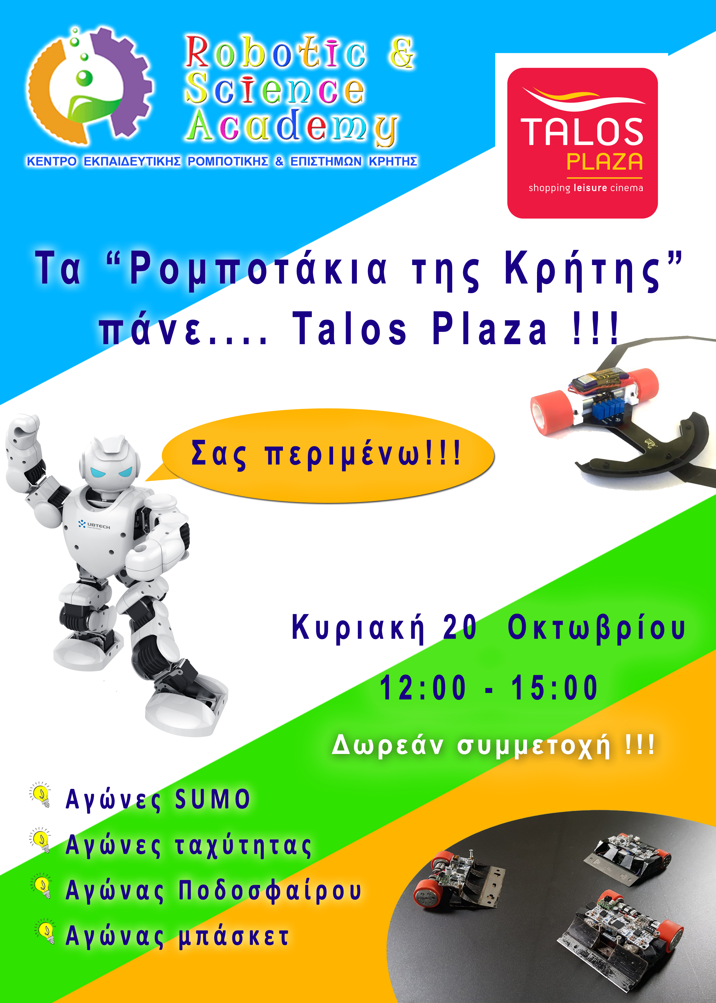 Το Κέντρο Εκπαιδευτικής Ρομποτικής & Επιστημών Κρήτης και το TALOS PLAZA, έχουν προσφέρει ήδη από την προηγούμενη χρονιά (2018) πολύ καινοτόμες και ουσιαστικές εκδηλώσεις στο κοινό της Κρήτης.