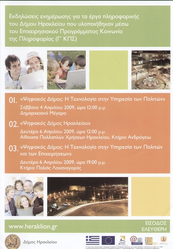 Εκδηλώσεις Ενημέρωσης για τα Έργα Πληροφορικής του Δήμου Ηρακλείου που υλοποιήθηκαν μέσω του Επιχειρησιακού Προγράμματος "Κοινωνία της Πληροφορίας". Θα γίνει παρουσίαση όλων των νέων εφαρμογών που έχουν αναπτυχθεί στο πλαίσιο της "Κοινωνίας της Πληροφορίας" και αυτών που προγραμματίζονται στο πλαίσιο του ΕΣΠΑ 2007-2013.