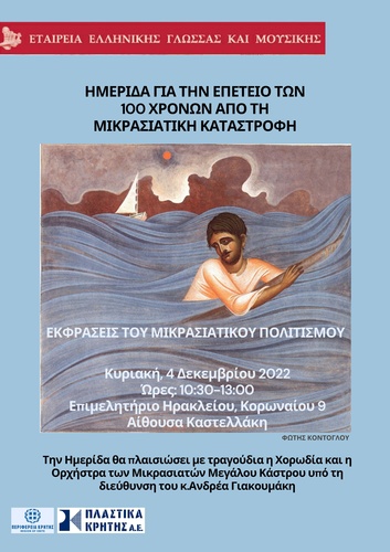 Εκδήλωση Μνήμης για τα 100 χρόνια από τη Μικρασιατική Καταστροφή με τίτλο "Εκφράσεις του Μικρασιατικού Πολιτισμού" που συνδιοργανώνει η Εταιρεία Ελληνικής Γλώσσας και Μουσικής με την Περιφέρεια Κρήτης και θα γίνει την Κυριακή 4 Δεκεμβρίου στο Επιμελητήριο, ώρα: 10:30.