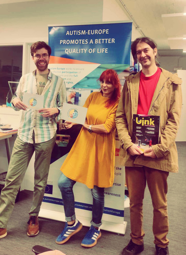 Επίσκεψη στα γραφεία του AUTISM - EUROPE στις Βρυξέλλες, του Διεθνούς Συλλόγου για τα δικαιώματα των ανθρώπων με αυτισμό. Φωτ.: [αρ.] Christian Takow, Advocacy & Project Officer του AUTISM - EUROPE, με τους δημιουργούς της ομάδας HER-autism, Αγγελική Μπαλτατζή και Μανόλη Στρατήγη