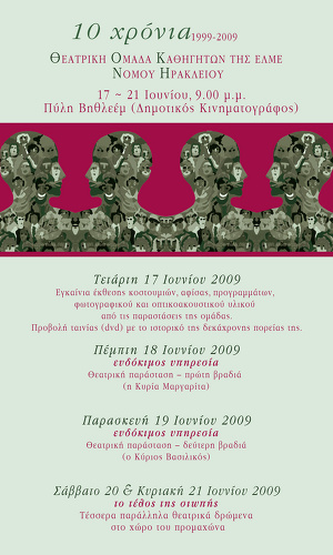 Η Θεατρική Ομάδα Καθηγητών Νομού Ηρακλείου γιορτάζοντας τη δεκάχρονη πορεία της στην πολιτιστική ζωή της πόλης, διοργανώνει ένα πενθήμερο εκδηλώσεων από Τετάρτη 17 έως Κυριακή 21 Ιουνίου 2009 στην Πύλη Βηθλεέμ (Δημοτικός Κινηματογράφος).