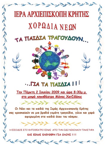 Οι Νέοι της Ιεράς Αρχιεπισκοπής Κρήτης (Ι.Α.Κ.) διοργανώνουν μουσική εκδήλωση με τίτλο "Τα παιδιά τραγουδούν για τα παιδιά". Όπως αναφέρει και ο τίτλος, η συναυλία αυτή είναι αφιερωμένη στα παιδιά όλου του κόσμου και ιδιαίτερα στα παιδιά εκείνα τα οποία έχουν δει ένα πιο σκληρό πρόσωπο από τη ζωή, που δεν ταιριάζει τόσο στην ευαίσθητη αυτή ηλικία. Θα ακουστούν τραγούδια αγαπημένα, γραμμένα από χέρια μεγάλων μουσικοσυνθετών όπως Μίκης Θεοδωράκης, Μάνος Χατζηδάκις, Nicola Piovani κ.α., και τα οποία θα ερμηνεύσει η Χορωδία των Νέων της ΙΑΚ υπό την διεύθυνση της μουσικού Ελευθερίας Καφετζάκη. Σας περιμένουμε λοιπόν την Πέμπτη 2 Ιουλίου στο μικρό κηποθέατρο Μάνος Χατζηδάκις (η είσοδος είναι επί της Λεωφόρου Πλαστήρα, αμέσως μετά τον Προμαχώνα Μαρτινέγκο) στις 8.30 το βράδυ, για να περάσουμε μια όμορφη οπτικοακουστικά βραδιά, κάτω από το καλοκαιρινό φεγγάρι. Η είσοδος είναι ελεύθερη.