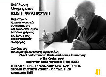 Εκδήλωση Μνήμης στον ΚΩΣΤΗ ΦΡΑΓΚΟΥΛΗ τη Δευτέρα 31 Αυγούστου στις 21:30 στο Κηποθέατρο «Ν. ΚΑΖΑΝΤΖΑΚΗΣ». Συμμετέχουν Μουσικά συγκροτήματα και Χορευτικοί όμιλοι. Απόδοση μέρους του έργου του και βιογραφικές αναφορές .Είσοδος Ελεύθερη