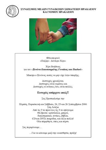 Ο Σύνδεσμος Μελών Γυναικείων Σωματείων Ηρακλείου και Ν. Ηρακλείου θα διοργανώσει για τρίτη συνεχή χρονιά «Παζάρι Δεύτερο Χέρι – Χέρι Βοήθειας», το οποίο θα λάβει χώρα στον εξωτερικό χώρο της Λότζια στις 24, 25 και 26 Σεπτεμβρίου 2009, από τις 9:00 – 17.00. Εκεί θα εκτεθούν αντικείμενα από δεύτερο χέρι, όπως γυαλικά, διακοσμητικά, είδη σπιτιού, αντίκες, κοσμήματα, βιβλία, cd και dvd, παιχνίδια και άλλα πολλά, που προέρχονται από δωρεές των μελών του Συνδέσμου, φίλων τους και πολλών Ηρακλειωτών.