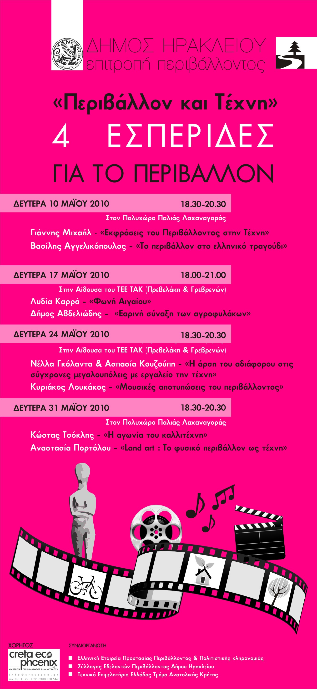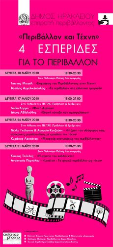 Η Επιτροπή Περιβάλλοντος του Δήμου Ηρακλείου διοργανώνει 4 Εσπερίδες με θέμα «Περιβάλλον και Τέχνη», στις 10, 17, 24 και 31 Μαϊου στον Πολυχώρο της Παλιάς Λαχαναγοράς και στην αίθουσα του ΤΕΕ/ΤΑΚ.