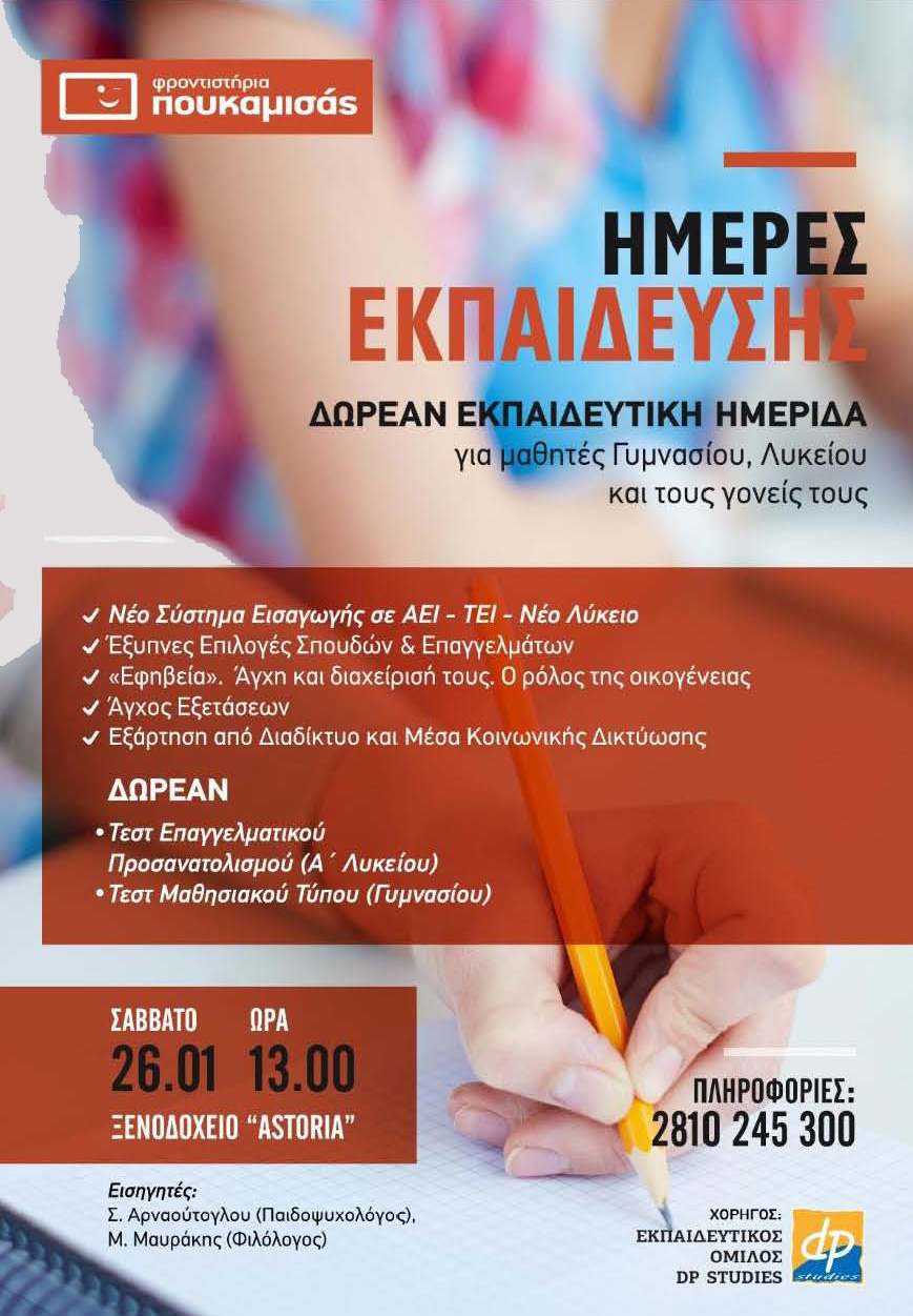 Για άλλη μια χρονιά τα Φροντιστήρια Πουκαμισάς Ηρακλείου πραγματοποιούν ΔΩΡΕΑΝ Εκπαιδευτική Ημερίδα με το διακριτικό τίτλο «Ημέρες Εκπαίδευσης» για μαθητές Γυμνασίου, Λυκείου και τους γονείς τους, το Σάββατο 26/1/19 στις 13.00 στο ξενοδοχείο Astoria.