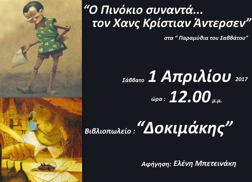 Σάββατο 1 Απρίλη 2017, ώρα 12.00 το μεσημέρι τα «Παραμύθια του Σαββάτου»,στο βιβλιοπωλείο « Δοκιμάκης», στην πιο καλή τους ώρα. Με καλεσμένους δυο πολυαγαπημένους ήρωες που γιορτάζουν τούτες τις μέρες. Ο Πινόκιο θα είναι εκεί συντροφιά με τον Χανς Κρίστιαν Άντερσεν. Μπορεί οι δύο τους να μην συναντήθηκαν ποτέ αλλά έζησαν τον ίδιο αιώνα κι έχουν πολλά να μας πουν…