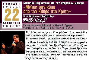 Μουσική Παράσταση «Μνήμη σαν κύμα από την Κύπρο στη Κρήτη» με τον Ανδρέα Α. Αρτέμη την ΚΥΡΙΑΚΗ 22 ΑΥΓΟΥΣΤΟΥ στις 21:30 στο Κηποθέατρο «Μ.Χατζιδάκις». Ελεύθερη είσοδο