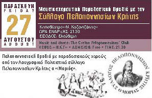 Πελοποννησιακή Βραδιά με παραδοσιακούς χορούς από τον Λαογραφικό Πολιτιστικό σύλλογο Πελοποννήσιων Κρήτης ο «Μοριάς» την ΠΑΡΑΣΚΕΥΗ 27 ΑΥΓΟΥΣΤΟΥ 2010 στις 21:30 στο Κηποθέατρο «Ν. Καζαντζάκης».