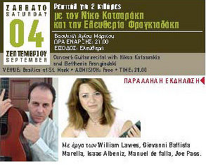 Ρεσιτάλ για 2 κιθάρες με τον Νίκο Κατσαράκη και την Ελευθερία Φραγκιαδάκη. Παράλληλη εκδήλωση, «Βασιλική Αγίου Μάρκου» με Ελεύθερη είσοδο το ΣΑΒΒΑΤΟ 4 ΑΥΓΟΥΣΤΟΥ 2010 στις 21:00.