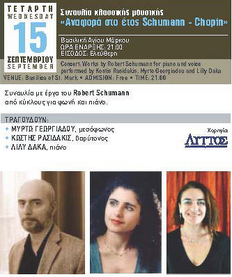 Συναυλία με έργα Robert Schumann από κύκλους για φωνή και πιάνο «Αναφορά στο έτος SchumannChopin». Τραγουδούν: Κωστής Ρασιδάκης, Μυρτώ Γεωργιάδου, Στο πιάνο η Λίλυ Δάκα την ΤΕΤΑΡΤΗ 15 ΣΕΠΤΕΜΒΡΙΟΥ 2010 στις 21:00 στη «Βασιλική Αγίου Μάρκου» με Ελεύθερη Είσοδο.