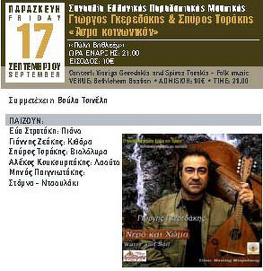 Συναυλία Ελληνικής Παραδοσιακής Μουσικής με τον Γιώργη Γκερεδάκη και τον Σπύρο Τοράκη «Άσμα κοινωνικό» την ΠΑΡΑΣΚΕΥΗ 17 ΣΕΠΤΕΜΒΡΙΟΥ 2010 στις 21:00 στην «Πύλη Βηθλεέμ».