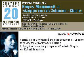 Ρεσιτάλ πιάνου «Αναφορά στο έτος Schumann – Chopin» της διαπρεπούς Ελληνίδας πιανίστας ΝΤΟΡΑΣ ΜΠΑΚΟΠΟΥΛΟΥ με έργα Frederic Chopin και Robert Schumann τη ΔΕΥΤΕΡΑ 20 ΣΕΠΤΕΜΒΡΙΟΥ 2010 στις 21:00 στη «Βασιλική Αγίου Μάρκου» με Ελεύθερη είσοδο.