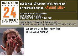 Παράσταση Σύγχρονου Ποιητικού Χορού με ζωντανή μουσική «ΑΓΑΠΗ ΜΟΥ». Ένα έργο του Ταξιάρχη Βασιλάκου με την ομάδα ANASSA την ΠΑΡΑΣΚΕΥΗ 24 ΣΕΠΤΕΜΒΡΙΟΥ 2010 στις 21:00 στο Κηποθέατρο «Μ.Χατζιδάκις».