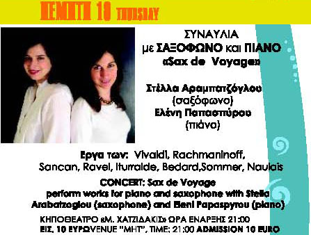 ΣΥΝΑΥΛΙΑ με ΣΑΞΟΦΩΝΟ και ΠΙΑΝΟ «Sax de Voyage» Συμμετέχουν: Στέλλα Αραμπατζόγλου (σαξόφωνο) και Ελένη Παπασπύρου (πιάνο).