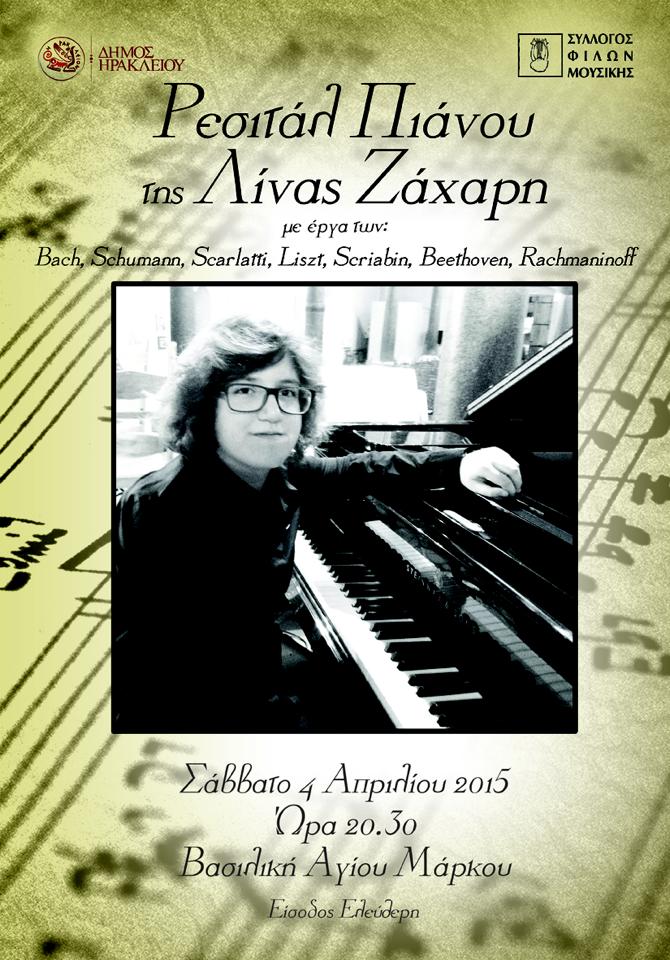 Ο Σύλλογος Φίλων Μουσικής Ηρακλείου, υπό την αιγίδα του Δήμου Ηρακλείου, διοργανώνει ρεσιτάλ πιάνου της Λίνας Ζάχαρη.