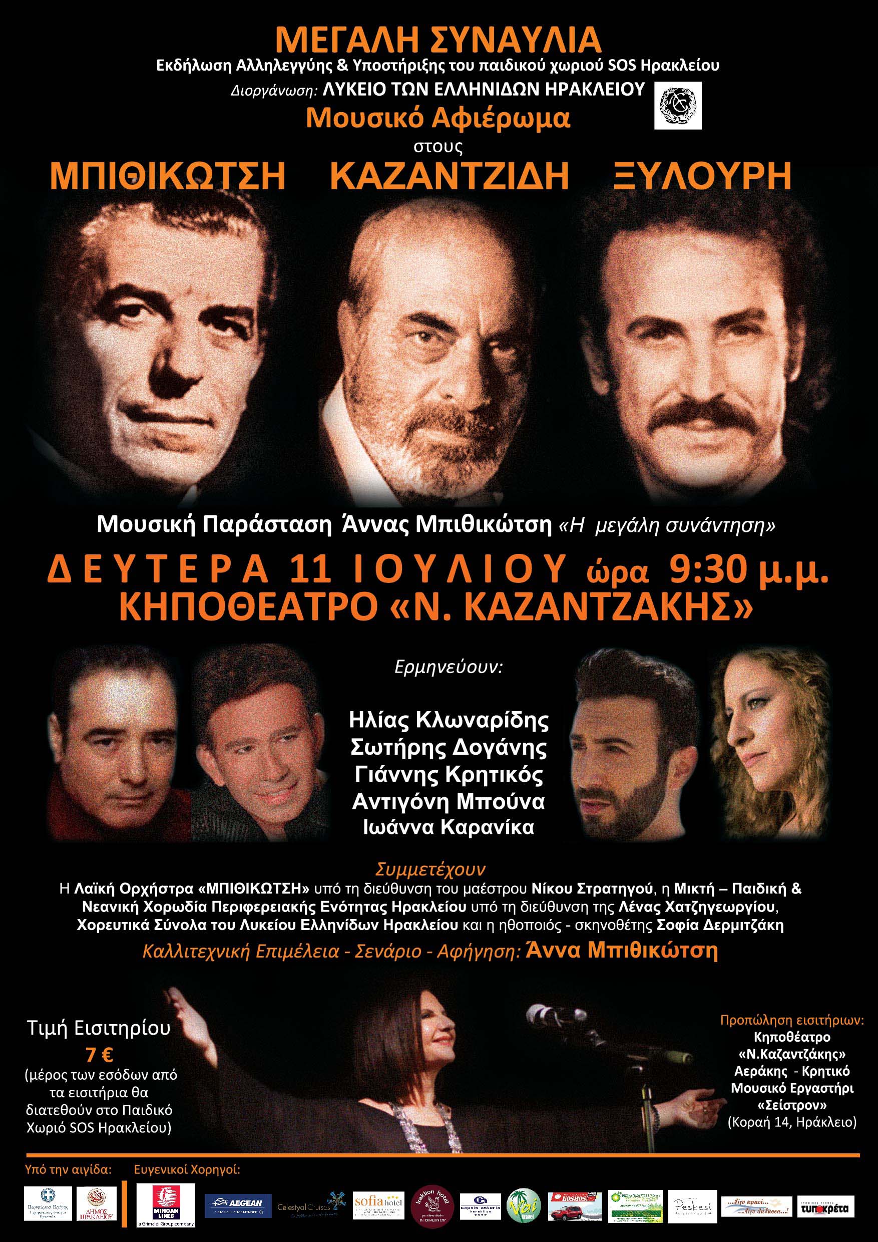 Με την στήριξη της Περιφέρειας Κρήτης-Περιφερειακή Ενότητα Ηρακλείου, και του δήμου Ηρακλείου, θα πραγματοποιηθεί το «Μουσικό Αφιέρωμα» στους Γρηγόρη Μπιθικώτση, Στέλιο Καζαντζίδη και Νίκο Ξυλούρη με τη μουσική παράσταση της Άννας Μπιθικώτση «Η μεγάλη συνάντηση» την Δευτέρα 11 Ιουλίου 2016 στις 9:30 το βράδυ στο Κηποθέατρο «Ν. Καζαντζάκης». Η συναυλία, με την διοργάνωση του Λυκείου Ελληνίδων Ηρακλείου, πραγματοποιείται για την στήριξη- δημιουργία του Παιδικού Χωριού SOS στο Ηράκλειο.