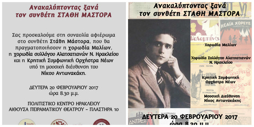 Σας προσκαλούμε στη συναυλία αφιέρωμα στο συνθέτη Στάθη Μάστορα, που θα πραγματοποιήσουν η χορωδία Μαλίων, η χορωδία συλλόγου Αλατσατιανών Ν. Ηρακλείου και η Κρητική Συμφωνική Ορχήστρα Νέων υπό τη μουσική διεύθυνση του Νίκου Αντωνακάκη.