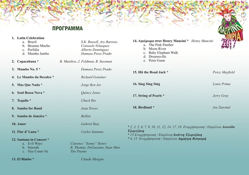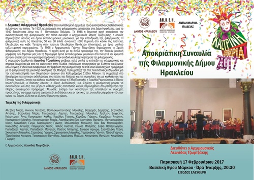 Συνεχίζονται οι εκδηλώσεις της «Καστρινής Αποκριάς 2017» με συναυλία της Φιλαρμονικής του Δήμου Ηρακλείου την Παρασκευή 17 Φεβρουαρίου στην Βασιλική του Αγίου Μάρκου. Η ώρα έναρξης είναι στις 20:30 και η είσοδος είναι ελεύθερη για το κοινό. H Φιλαρμονική θα ερμηνεύσει έργα latin, καθώς και γνωστές μελωδίες μουσικής jazz υπό την Διεύθυνση του Αρχιμουσικού κ. Λεωνίδα Τζωρτζάκη.