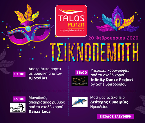 Η Τσικνοπέμπτη είναι εδώ!!! 17:00 Η πιο κεφάτη μουσική από τον Dj Stelios I-Dj Club 18:00 Υπέροχες χορογραφίες από τη σχολή χορού Infinity Dance Project by Sofia Spiropoulou 19:00 Μοναδικός αποκριάτικος ρυθμός από τη σχολή χορού Danza Loca Μαζί μας το Σχολείο Δεύτερης Ευκαιρίας Ηρακλείου Είσοδος ελεύθερη. Συμμετέχοντες: Σχολή χορού Infinity Dance Project με τη Σοφία Σπυροπούλου και τους συνεργάτες της Η Σοφία Σπυροπούλου είναι πρωταθλήτρια Ελλάδος και finalist στο Παγκόσμιο Πρωτάθλημα Κυπέλλου στην Αμερική. Μια σχολή με πολλές διακρίσεις στην Ελλάδα και το εξωτερικό από τους συνεργάτες και τους μαθητές. Απευθύνεται σε παιδιά και ενήλικες από τεσσάρων ετών και άνω, με προοπτική σε festival και διαγωνισμούς σε Ελλάδα και εξωτερικό. Επίσης, πραγματοποιεί σεμινάρια και μαθήματα από επώνυμους χορευτές και δασκάλους. Η σχολή INFINITY DANCE PROJECT Σοφία Σπυροπούλου και οι συνεργάτες της, σας προσφέρουν ένα μήνα δωρεάν μαθήματα σε τμήματα της αρεσκείας σας. Την σχολή θα την βρείτε Δημοκρατίας και Χρυσόστομου 44.