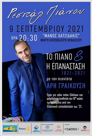 Με το Ρεσιτάλ του Άρη Γραικούση «Το πιάνο και η επανάσταση 1821 -2021» συνεχίζονται οι εκδηλώσεις στο Κηποθέατρο «Μ. Χατζιδάκις» την Πέμπτη 9 Σεπτεμβρίου. Πρόκειται για μία εκδήλωση του Ροταριανού Ομίλου ΗΡΑΚΛΕΙΟ-CANDIA. Το πρόγραμμα περιλαμβάνει έργα για σόλο πιάνο Ελλήνων και φιλελλήνων συνθετών του 19ου αιώνα, εμπνευσμένα από την Ελληνική επανάσταση του 1821.