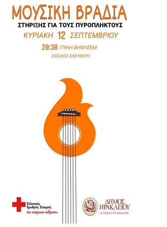 «Μουσική βραδιά για τους πυρόπληκτους» είναι ο τίτλος της εκδήλωσης που θα πραγματοποιηθεί την Κυριακή 12 Σεπτεμβρίου στο ανοικτό θέατρο της Πύλης Βηθλεέμ. Αφορμή για τη διοργάνωση της μουσικής αυτής βραδιάς, αποτέλεσαν τα τραγικά γεγονότα του Αυγούστου. Έτσι μία ομάδα μουσικών, σε συνεργασία με το Δήμο Ηρακλείου και τον Ερυθρό Σταυρό, θέλησαν να συμβάλλουν με τον δικό τους τρόπο στην προσπάθεια στήριξης των πληγέντων. Η συναυλία, θα περιλαμβάνει τραγούδια τόσο του ελληνικού, όσο και του ξένου ρεπερτορίου. Η είσοδος θα είναι ελεύθερη για το κοινό και όσοι επιθυμούν, θα έχουν τη δυνατότητα να διαθέσουν ένα ποσό σε κουμπαρά που θα υπάρχει στο χώρο της Πύλης Βηθλεέμ. Όλα τα έσοδα θα διατεθούν στους πυρόπληκτους της χώρας μας.