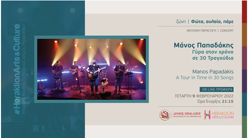 Μια μουσική "Γύρα στον χρόνο σε 30 Τραγούδια" με τον Μάνο Παπαδάκη, έρχεται την Tετάρτη 9 Φεβρουαρίου 2022 στις 21:15 στο διαδικτυακό κανάλι πολιτισμού του Δήμου Ηρακλείου - Heraklion Arts and Culture!