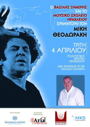 Ο Βασίλης Ξημέρης και το Μουσικό Σχολείο Ηρακλείου συναντούν τον μεγάλο μουσικοσυνθέτη Μίκη Θεοδωράκη σε μια συναυλία που θα πραγματοποιηθεί με ελεύθερη είσοδο, την Τρίτη 4 Απριλίου και ώρα 9 το βράδυ στο Πολιτιστικό Κέντρο Ηρακλείου (αίθουσα Ανδρέα και Μαρίας Καλοκαιρινού), υπό την διοργάνωση της Περιφέρειας Κρήτης.