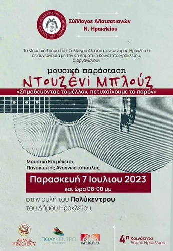 Το Μουσικό τμήμα του Συλλόγου Αλατσατιανών Νομού Ηρακλείου σε συνεργασία με την 4η Κοινότητα διοργανώνουν την Μουσική παράσταση ΝΤΟΥΖΕΝΙ ΜΠΛΟΥΖ "Σημαδεύοντας το μέλλον, πετυχαίνουμε το παρόν" την Παρασκευή 7 Ιουλίου 2023 και ώρα 20:00 στην αυλή του Πολύκεντρου του Δήμου Ηρακλείου.