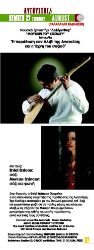 Μουσικό εργαστήρι «Λαβύρινθος» «ΜΟΥΣΙΚΕΣ  ΤΟΥ ΚΟΣΜΟΥ». Συναυλία «Η παράδοση των Αλεβί της Ανατολίας και η τέχνη του σαζιού» Με τους Erdal Erzincam ,Mercan Erzincan την Πέμπτη 27 Αυγούστου στις 21:30 στην Χαμηλή  Πλατεία της ΠΥΛΗΣ ΒHΘΛΕΕΜ. Είσοδος Ελεύθερη