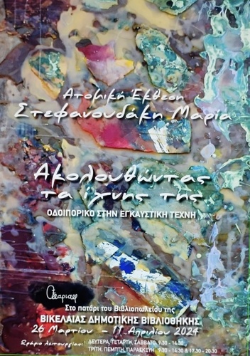 Η ατομική έκθεση της Μαρίας Στεφανουδάκη με τίτλο «Ακολουθώντας τα ίχνη της» παρουσιάζεται, από την Δευτέρα 26 Μαρτίου έως και την Πέμπτη 11 Απριλίου 2024, στο Πατάρι του Βιβλιοπωλείου της Βικελαίας Δημοτικής Βιβλιοθήκης.