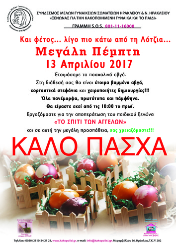 Πασχαλινό Παζάρι του Ξενώνα για την κακοποιημένη γυναίκα και το παιδί τη Μεγάλη Πέμπτη 13 Απριλίου 2017 από τις 10 το πρωί λίγο πιο κάτω από τη Λότζια