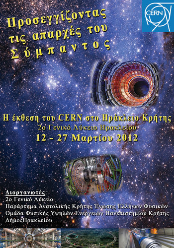 Την Τρίτη 13 Μαρτίου 2012 και ώρα 19:30 θα πραγματοποιηθεί στην αίθουσα "Ανδρόγεω" του Δήμου Ηρακλείου η επίσημη Τελετή Έναρξης της Έκθεσης του CERN «Προσεγγίζοντας τις απαρχές του Σύμπαντος». Η έκθεση θα διαρκέσει από Δευτέρα 12 Μαρτίου έως και Τρίτη 27 Μαρτίου 2012 και θα φιλοξενείται στην αίθουσα πολλαπλών χρήσεων του 2ου Γενικού Λυκείου Ηρακλείου (Κονδυλάκη 32 ). Διοργανώνεται σε συνεργασία της Εκπαιδευτικής και Πανεπιστημιακής κοινότητας (2ο ΓΕΛ Ηρακλείου, Παράρτημα Ανατολικής Κρήτης της Ένωσης Ελλήνων Φυσικών, ομάδα Φυσικής Υψηλών Ενεργειών του Πανεπιστημίου Κρήτης,) με το Δήμο Ηρακλείου.