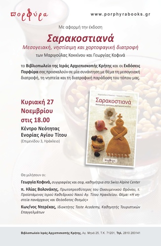 Με αφορμή την έκδοση Σαρακοστιανά Μεσογειακή, νηστίσιμη και χορτοφαγική διατροφή των Μαριγούλας Κοκκίνου και Γεωργίας Κοφινά το Βιβλιοπωλείο της Ιεράς Αρχιεπισκοπής Κρήτης και οι Εκδόσεις Πορφύρα σας προσκαλούν σε μία συνάντηση με θέμα τη μεσογειακή διατροφή, τη νηστεία και τη διατροφική παράδοση του τόπου μας.