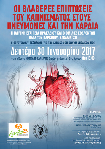 Τη Δευτέρα 30 Ιανουαρίου 2017 στις 19:00 στην αίθουσα Μ.Καρέλλης στο δημοτικό κτήριο της οδού Ανδρόγεω, η Ιατρική Εταιρεία Ηρακλείου και ο Όμιλος Εθελοντών Κατά του Καρκίνου διοργανώνουν εκδήλωση με θέμα "Οι βλαβερές επιπτώσεις του καπνίσματος στους πνεύμονες και την καρδιά"