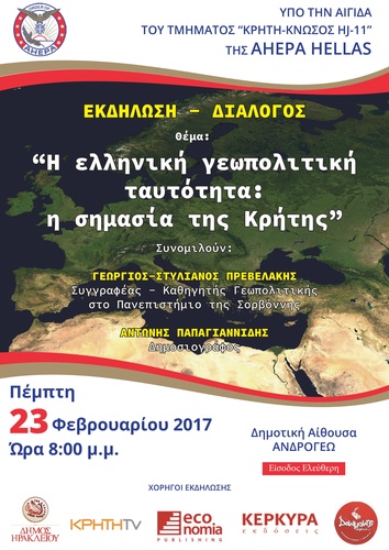 Tο Τμήμα “KRHTH-ΚΝΩΣΟΣ HJ-11” της AHEPA HELLAS, με αφετηρία το βιβλίο “Ποιοι Είμαστε; Γεωπολιτική της ελληνικής ταυτότητας”, διοργανώνει εκδήλωση-διάλογο, την Πέμπτη 23η Φεβρουαρίου 2017 στις 8.00 μ.μ., στη δημοτική αίθουσα της οδού Ανδρόγεω 2, με θέμα: “Η γεωπολιτική της ελληνικής ταυτότητας: η σημασία της Κρήτης”.