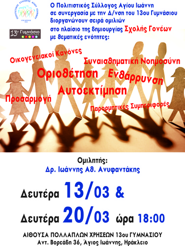 Τον μήνα Μάρτιο θα πραγματοποιηθούν δύο συναντήσεις: Δευτέρα 13/03 18:00 έως 20:00 και Δευτέρα 20/03 18:00 έως 20:00, στην αίθουσα πολλαπλών χρήσεων του 13ου Γυμνασίου. Τις ομάδες συντονίζει Δρ. Γιάννης Ανυφαντάκης, ψυχολόγος.