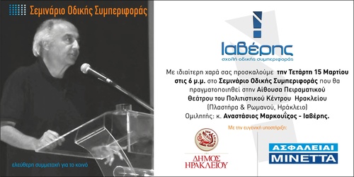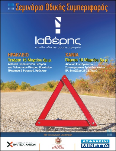 Πιο συγκεκριμένα ο ΙΑΒΕΡΗΣ θα μιλήσει την Τετάρτη 15 Μαρτίου στις 6μ.μ. στο Ηράκλειο στην Αίθουσα Πειραματικού Θεάτρου του Πολιτιστικού Κέντρου Ηρακλείου (Πλαστήρα & Ρωμανού). Η εκδήλωση, πραγματοποιείται με την υποστήριξη της ΜΙΝΕΤΤΑ Ασφαλιστικής και του δικτύου συνεργατών της, σε συνεργασία με τον Δήμο Ηράκλειου και συγκεκριμένα με την Αντιδημαρχία Πολιτικής Προστασίας και Δημοτικής Αστυνομίας. Με σκοπό την καλύτερη πρόληψη κατά των Οδικών ατυχημάτων αλλά και την προσπάθεια για δημιουργία Οδικής Παιδείας. Η είσοδος για το κοινό είναι ελεύθερη.